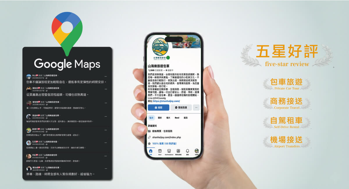 自我評價往往帶有主觀色彩,但來自實際體驗過服務的旅客回饋,才是真正具有參考價值的依據。山海樂在旅遊平台與合作通路上累積了上千則正面評價,長期獲得國內外旅客的高度肯定,這些真實回饋正是我們服務品質的最佳證明。